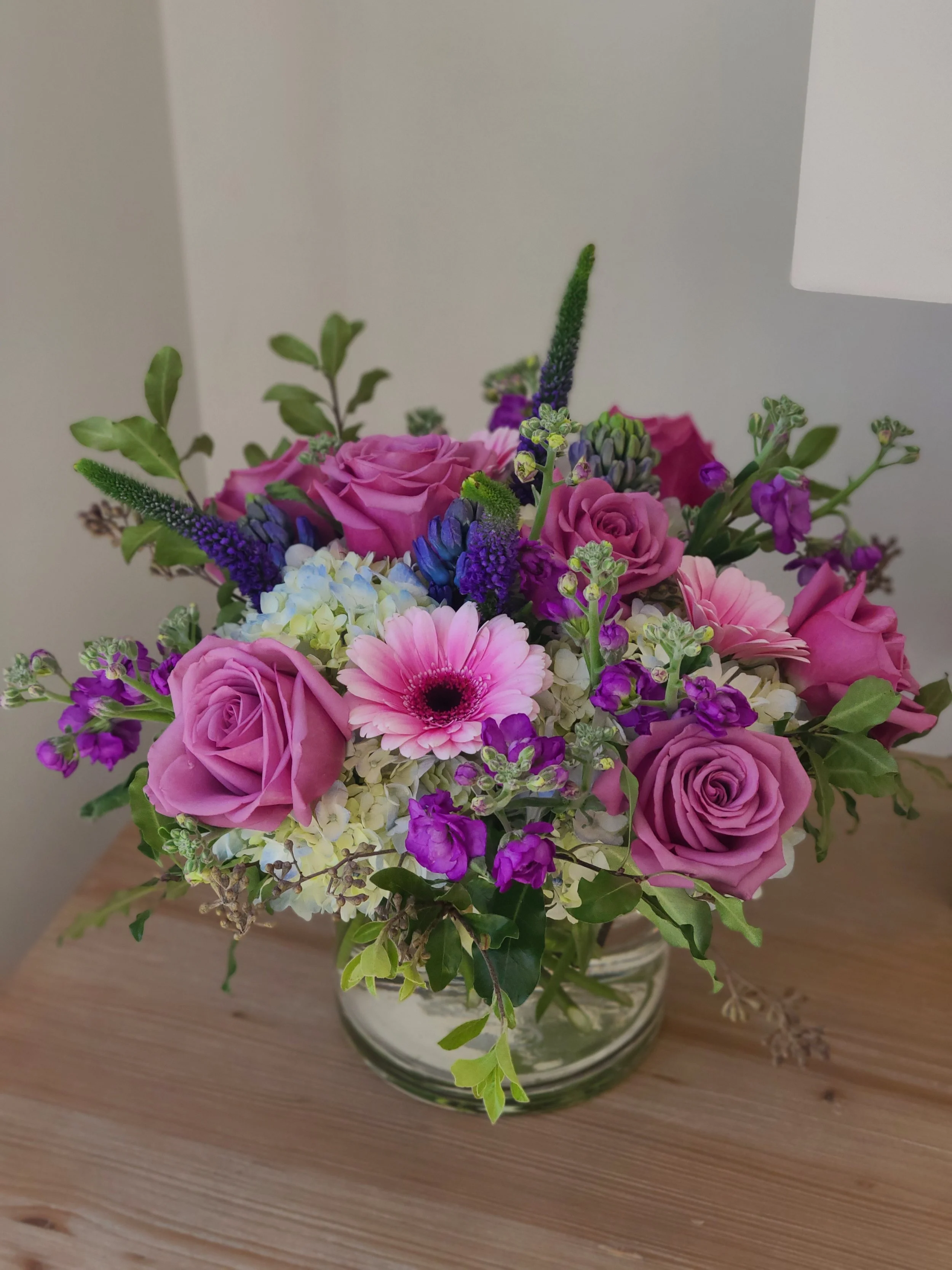 Short cylinder vase arrangement in lavander  and purple colors features roses, hyacinth (high seasonal), hydrangeas, Veronica's, and etc.